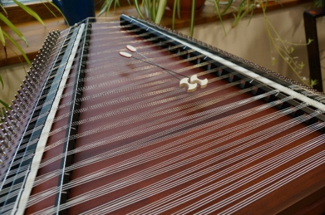 Klassisches Tenorhackbrett mit Dämpfung, die unter den Saiten liegt. Dort sind die Dämpfungsbalken